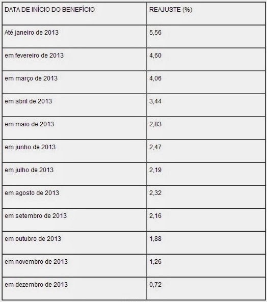 O Ministério da Previdência Social, conjuntamente com o Ministério da Fazenda, publicou a Portaria Interministerial número 19, de 10 de Janeiro de 2014, com o índice de reajuste a ser aplicado nos benefícios do INSS. O reajuste para quem tem mais de 12 meses de concessão será de 5,56%, os demais seguem a tabela abaixo que leva em consideração o mês em que o benefício foi concedido.